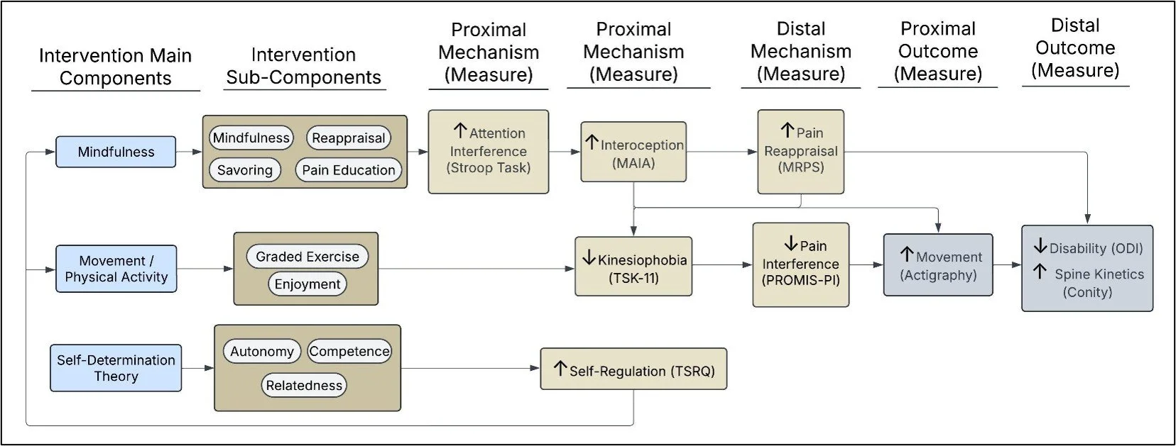 The Move-MORE conceptual model illustrates how its three primary components—mindfulness, movement/physical activity, and self-determination theory–based motivation—work synergistically to influence a cascade of psychological and behavioral mechanisms that ultimately improve pain and function. Mindfulness practices (including reappraisal, savoring, and pain education) are designed to reduce attention interference and enhance interoception, fostering more adaptive pain reappraisal. Movement practices (graded, enjoyable physical activity) aim to reduce kinesiophobia and pain interference by building confidence and positive affect toward movement. The self-determination component targets autonomy, competence, and relatedness, promoting self-regulation and sustained engagement in activity. These proximal mechanisms interact (i.e., interoception, reappraisal, and self-regulation reinforce one another) leading to increased movement and decreased disability. The model underscores a multilevel pathway in which psychological flexibility and intrinsic motivation mediate the effects of mindfulness and movement on functional recovery.